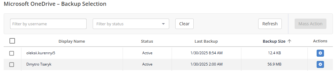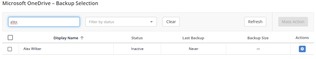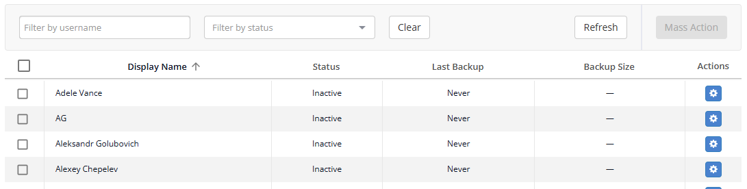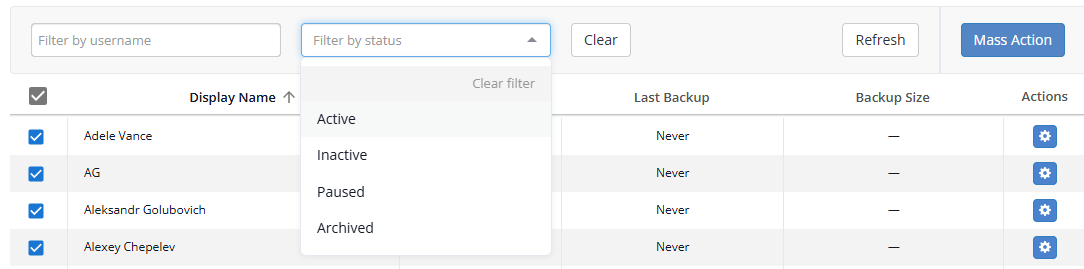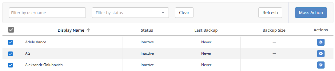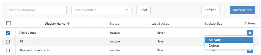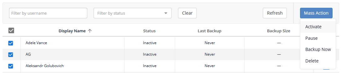 To instantly activate, start, pause, or cancel backup for a specific user account, use the quick actions available in the Actions column next to the account