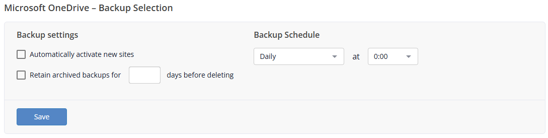 SETTING DESCRIPTION Automatically activate new sites Select to enable automatic detection and backup activation for new Microsoft 365 drives. Otherwise, you will need to manually activate backups for newly added user accounts. Retain archived backups for The system automatically archives backups if the license is removed or a site is deleted. Select this and enter the number of days to keep the automatic archive, or leave blank to keep it indefinitely. This does not affect manually paused backups. Backup Schedule Frequency of the backup task initiation. Available options: Daily, Every 3 days, Weekly, Three times per day at a specified time. In the Backup Selection block, select accounts for backup. All OneDrive accounts available for managing in ICAB by your Microsoft 365 admin account are shown in a table format.