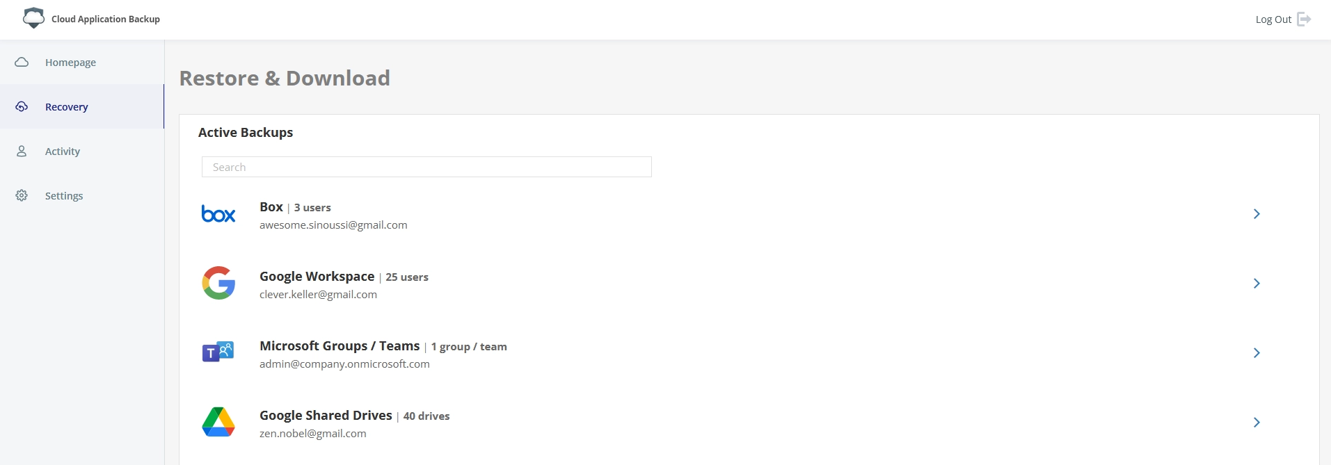 To restore and export data from the backups of Google Workspace, Google shared drives, Salesforce, Box, and Dropbox within Infrascale Cloud Application Backup (ICAB), go to ICAB Management Portal › Recovery.