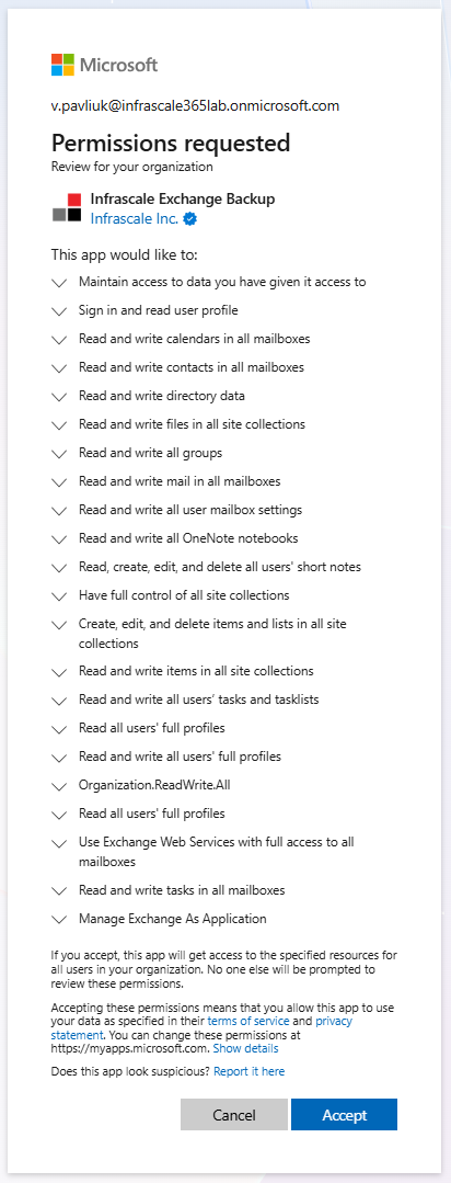 Click Accept to grant the permissions required for accessing Microsoft Exchange data.