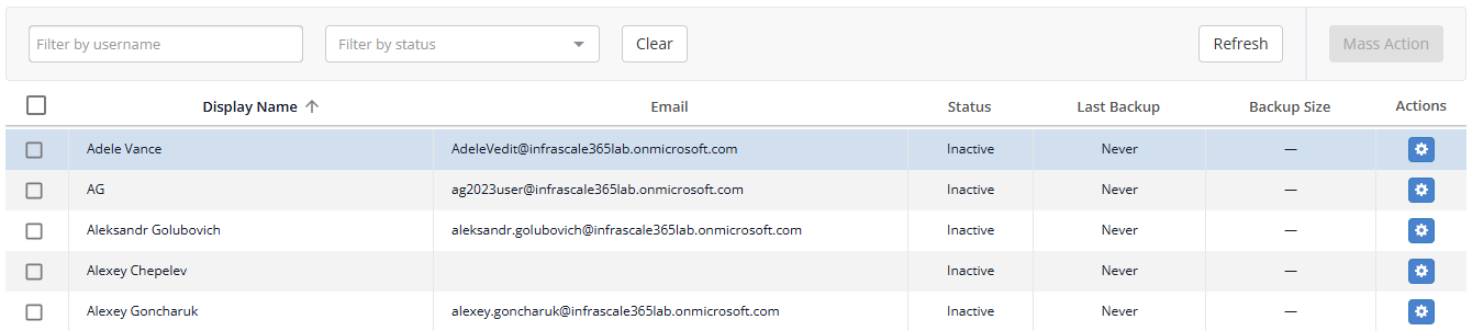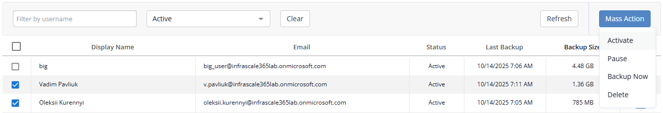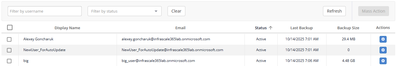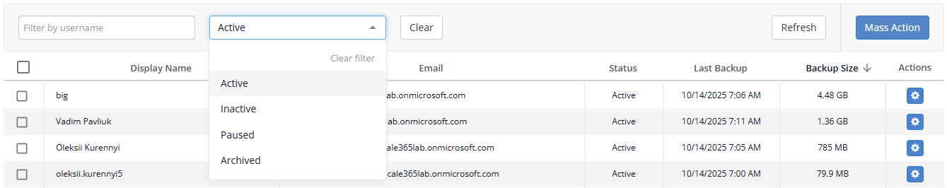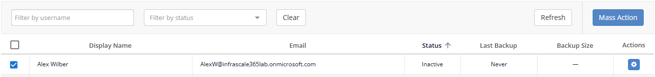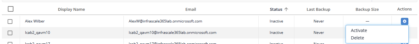 To instantly activate, start, pause, or cancel backup for a specific user account, use quick actions available in the Actions column next to the account