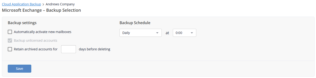 Configure backup settings for Microsoft 365 Exchange Online in Cloud Application Backup