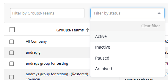 If you want to select teams or groups by their status, click Filter by status filter, and then select one of the statuses.