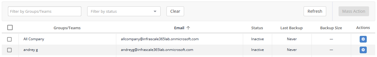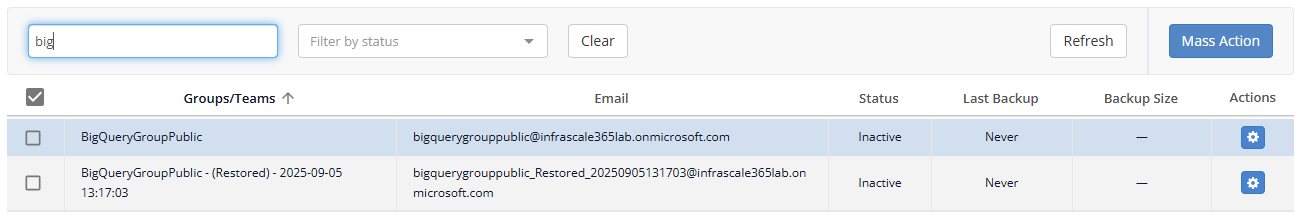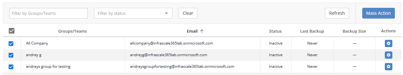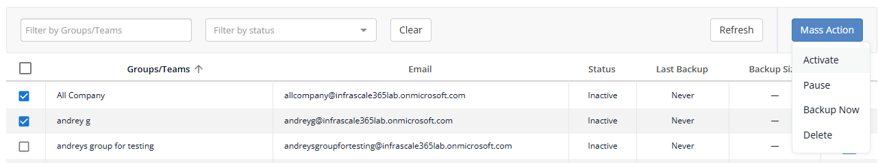 If you did not select to automatically activate backup for groups and teams in your Microsoft environment, you have to manually activate backup for individual groups and teams using quick actions, or for multiple teams and groups at once using batch actions.
