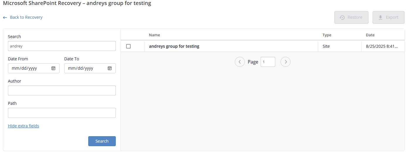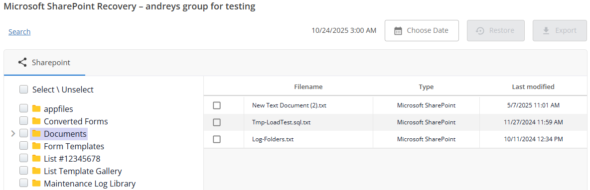 - After selecting the desired items, click Restore to recover the data to Microsoft 365 SharePoint, or click Export to download the data directly to your local computer.