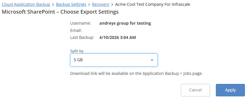 - If you selected Export in Step 8, use the Split by field to specify the size of the volumes into which the resulting ZIP archive will be split. Available options include 1 GB, 5 GB, 10 GB, and 20 GB. Once selected, click Apply.