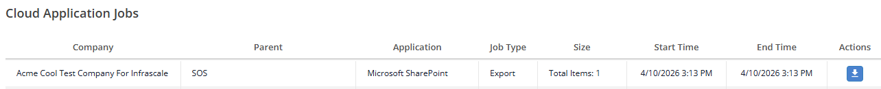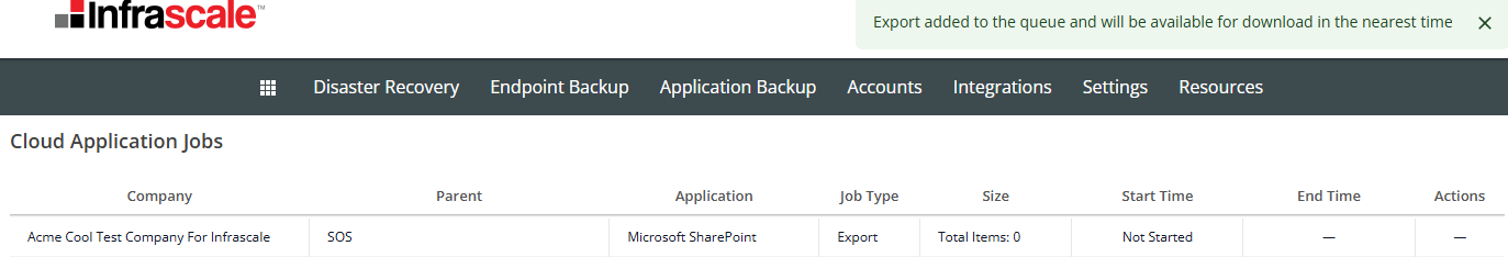 - After initiating the export, a confirmation message will appear in the upper-right corner of the page. You will then be redirected to the Cloud Application Jobs page, where you can monitor the progress of the export operation