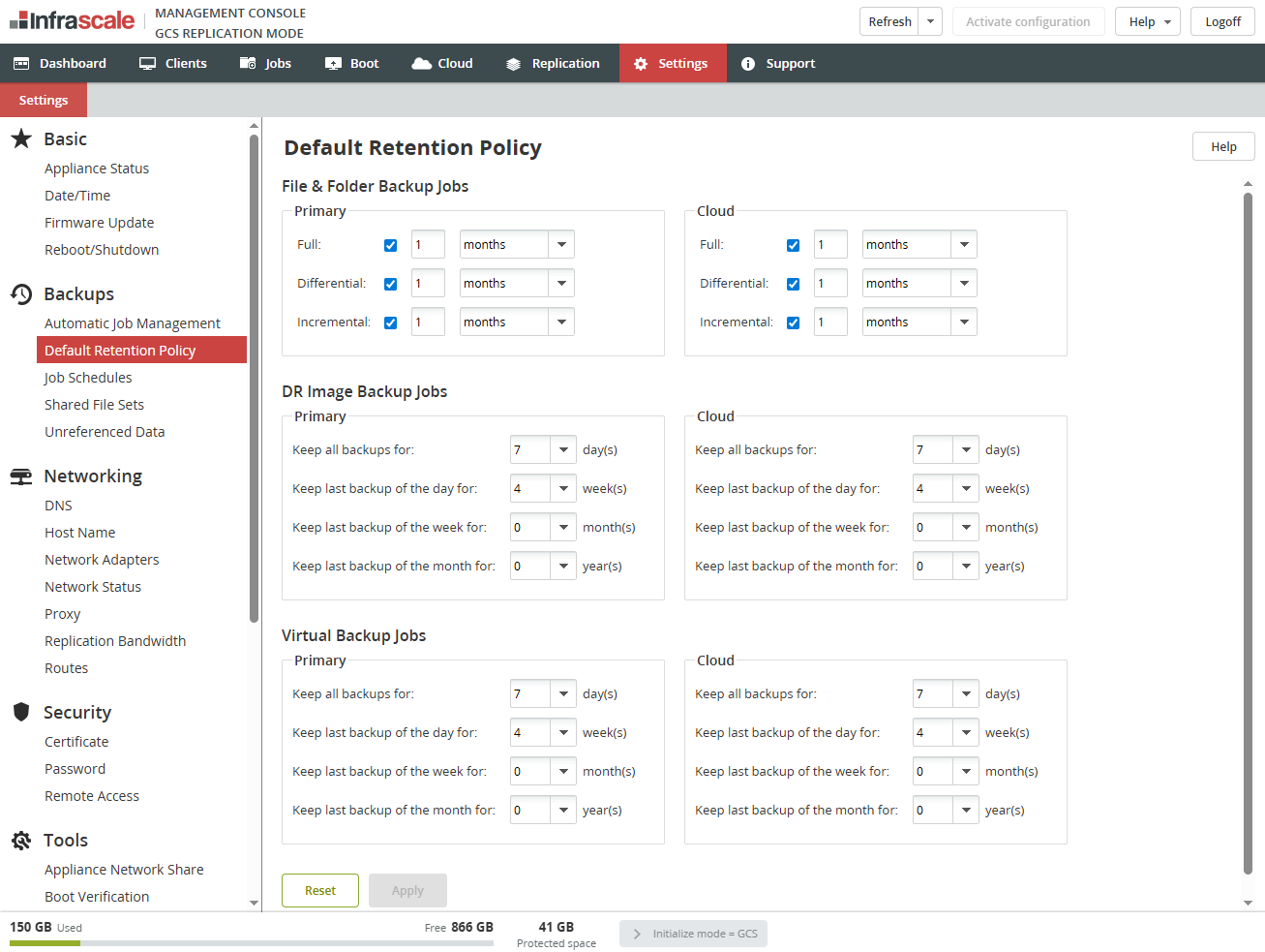 You can adjust the default retention settings for the primary Backup & Disaster Recovery appliance, as well as for the respective Cloud Secondary, if available.